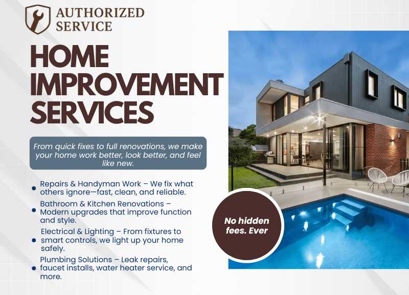 Big or small, every home project deserves expert care—and that’s what we deliver. From quick handyman fixes to full-scale renovations, Authorized Service is your single source for dependable, professional home improvement. No need to juggle contractors—we handle it all.